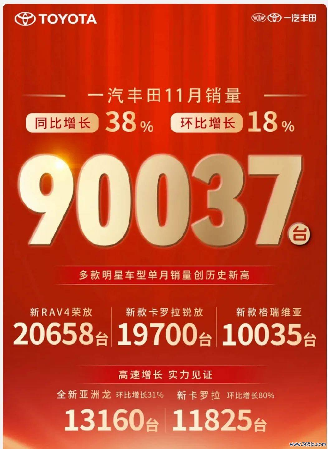 在合股品牌中,一汽丰田不异发扬拉风。11月份销量达到90037辆,同比增长38%,环比增长18%。其中,格瑞维亚当作一款30万级的MPV,月销量破万的获利尤为困难。而紧凑型SUV荣放RAV4则持续担当销量重负,销量达到20658辆,新款卡罗拉锐放销量也达到了19700辆。