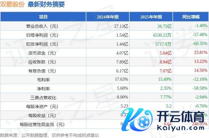 据证券之星公开数据整理开云体育(中国)官方网站,近期双箭股份(002381)发布2025年年报。范畴本陈说期末,公司营业总收入26.75亿元,同比下跌1.4%,归母净利润6530.23万元,同比下跌57.48%。按单季度数据看,第四季度营业总收入7.14亿元,同比下跌8.35%,第四季度归母净利润1163.8万元,同比下跌16.65%。本陈说期双箭股份公司应收账款体量较大,当期应收账款占最新年报归母净利润比达1368.46%。